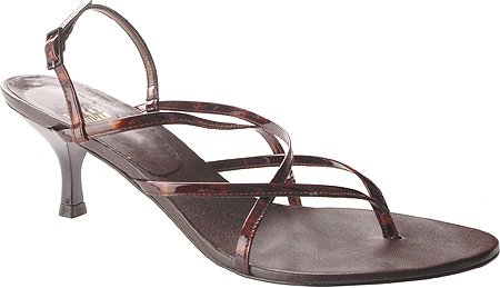 This patent thong sandal on a black enamel heel features an adjustable slingback for a perfect fit.
