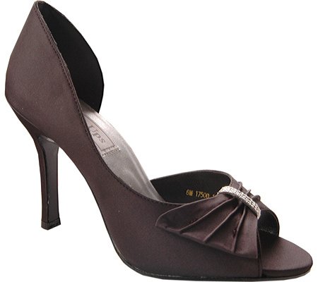 Elegant slip-on with pleated and ornamented vamp. Has an open side. White satin is dyeable.