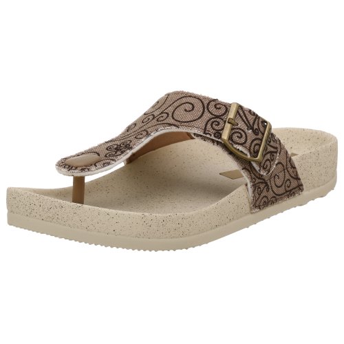 A casual feel and a natural look make the Destiny CA Thong Sandal one you'll be eager to slide into. You'll love the hip canvas uppers featuring a T-strap that secures with a bronze-tone metal buckle for an adjustable fit. The rubber toe-hold prevents odors or excess moisture and the cushioned footbed is more flexible and comfortable than cork. Every step in the Destiny CA Thong is lightweight and safe, thanks to a non-slip rubber outsole that's imprinted with a floral design.