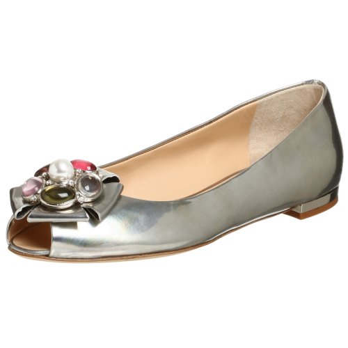Giuseppe Zanotti offers this luxury version of the ballet flat, a perfect accompaniment to dressy day or evening wear. Crafted from antique metallic leather, the upper features a peep toe design and a fabulous floral motif created from folded leather petals, polished, multi-colored stones and faux diamond inlays. The padded leather-lined footbed and flexible leather sole offer the utmost comfort. Pair with longer skirts and dresses to create a romantically feminine silhouette.