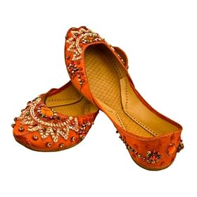 Beautifully Designed Ladies handmade embroidered Sequin leather Ballerina style Khussa Shoes / Pumps in a beautiful Orange colour. Elegant design with gems, pearls and decorative beaded work and encrusted beautiful diamantes. These Ladies Leather Pumps are ideal for Weddings, Evening Wear, Special Occasions and Casual Wear as well.